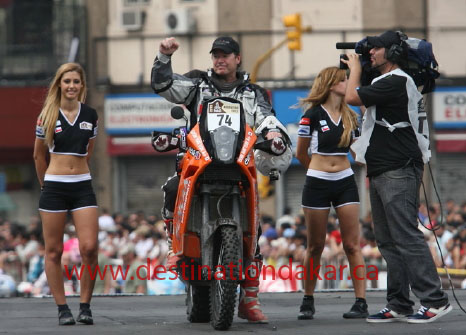 Listen to the clip above of Don onĀ Rally Radio, he sums Day 2 up pretty well. The audio starts with Don’s account of the fire he was exposed to on Day 1 of the rally. We think we would have run from the flames as well Don. The second part of the audio details Don’s comedy of errors today, except that it wasn’t very funny. First he left the start area without his time card, which he didn’t realize until he was flagged down by another competitor after about 80km. He had to race back to the start to get his card, but it wasn’t that simple. The organizers were not going to give him the start card, much back and forth discussion ensued, … Don said “what does this mean” and the woman organizer told him that he was out – the rally was finished for him. Still Don would not give up … so more discussion … then they phoned the head of the FIM and after much phone conversation he ruled that Don could start. The Dakar organizers argument was that it was too dangerous as the cars were now leaving and also that Don would not make his start time at the special stage. Don told them that it was their member of the organization that had directed him to start and that he was a fast rider and could make it to the special section for his start time. |